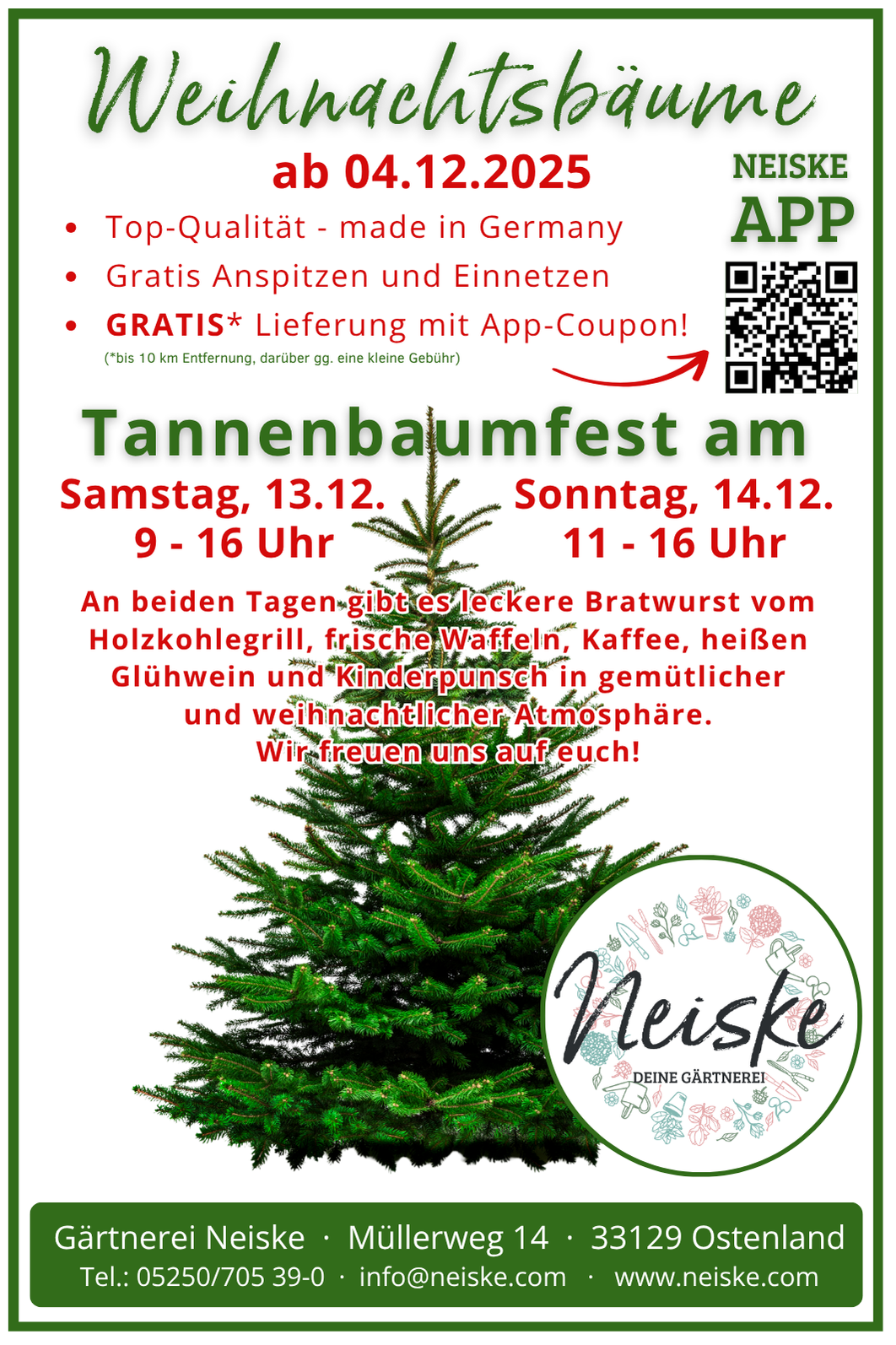 Hallo Weihnachtsfans, es ist wieder Tannenbaumzeit! 🎄✨ Ab dem 4. Dezember verwandelt sich die Gärtnerei Neiske in ein wahres Weihnachtsparadies! Wir haben für dich: Tannenbäume – frischer geht’s nicht! Gratis anspitzen & einnetzen, damit dein Baum direkt perfekt sitzt. Kostenlose Lieferung (bis 10 km, danach kleine Gebühr) – stressfrei bis zu deiner Tür mit Coupon in der App. Unsere beleuchtete Verkaufsfläche sorgt für echtes Weihnachtsfeeling. Großes Highlight: Besuche unser Tannenbaumfest am 13. & 14. Dezember 2025! 📅 13.12. Samstag: 9–16 Uhr 📅 14.12. Sonntag: 12–16 Uhr Mit leckerem Essen und Glühwein wird's richtig gemütlich! Komm vorbei, schnapp dir deinen Traumbaum und lass dich von der Magie der Weihnachtszeit verzaubern. Wir freuen uns riesig auf dich! Dein Weihnachtsbaum-Team der Gärtnerei Neiske 🎅